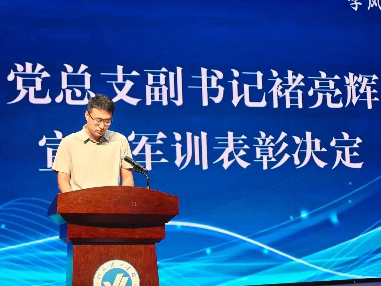 党总支副书记褚亮辉宣读军训表彰决定,并为先进集体、军训优秀学员和内务卫生先进宿舍颁奖,表彰证书是荣誉,更是新的起点,而学风建设正是我们承接这份荣誉的最佳答卷,寄语同学们把军训里的热血与坚持,转化为探索知识、锤炼本领的动力,用实际行动共建优良学风。