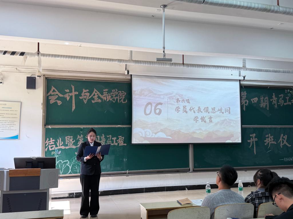 党总支副书记褚亮辉代表学院向第四期“青马工程”结业的同学表示祝贺,并对新学员提出三点殷切希望:一要坚定理想信念,做马克思主义的忠实践行者,不断增进对党的创新理论的政治认同、思想认同、理论认同、情感认同;二要坚持知行合一,做追求进步的模范带头者,努力将理论学习成果转化为推动学习和工作的实际能力;三要勇担时代重任,做矢志奋斗的青春奉献者,将个人发展融入国家与学校的事业发展中,展现青年担当。