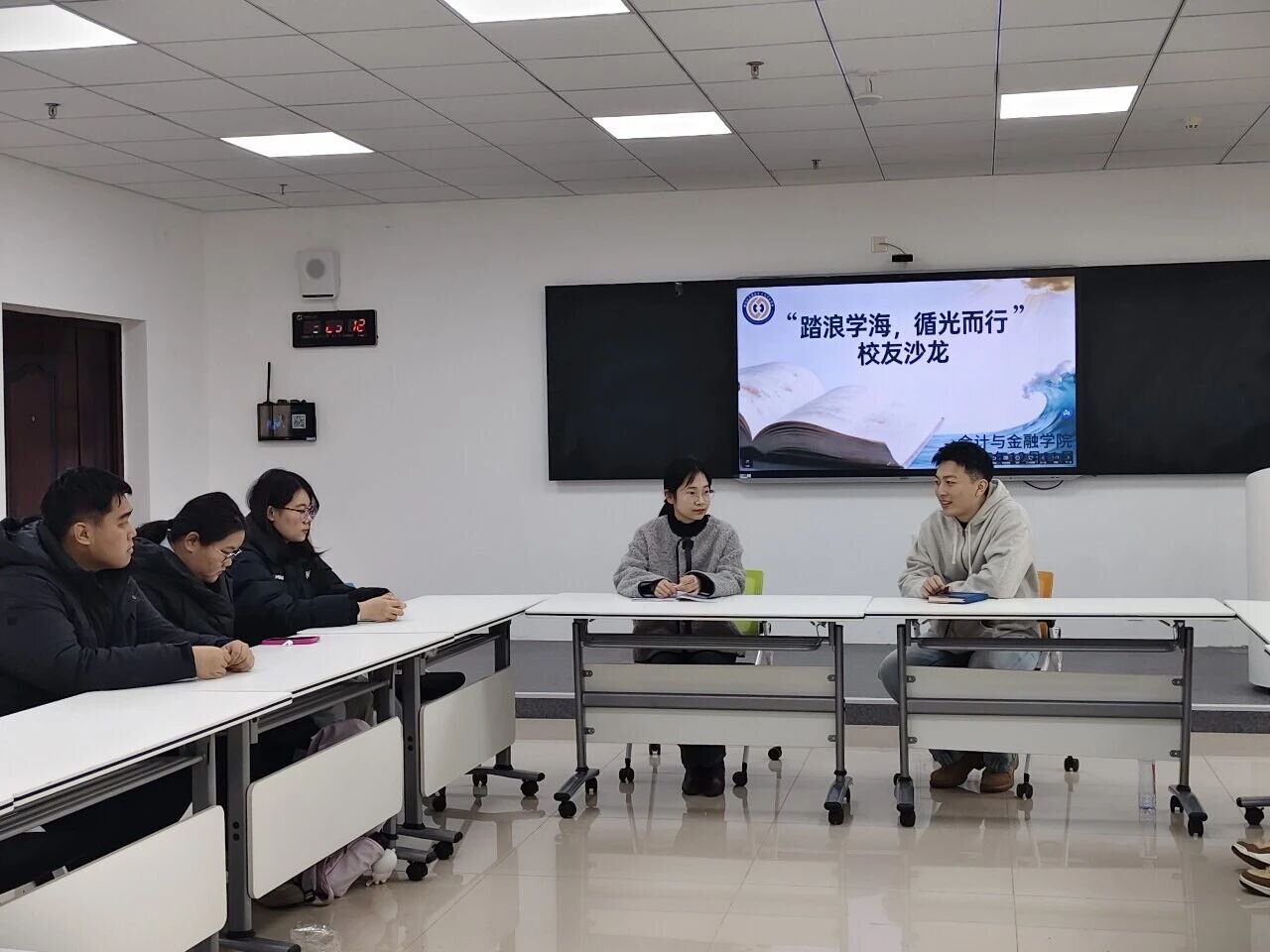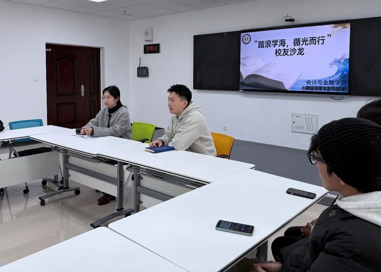 为帮助学生明晰学业规划方向,进一步提升学生升学就业筹备能力,12月11日,会计与金融学院于综合楼S203开展“踏浪学海,循光而行”优秀校友分享沙龙,辅导员范琳、优秀校友付展宇及学生代表共同参与本次活动。