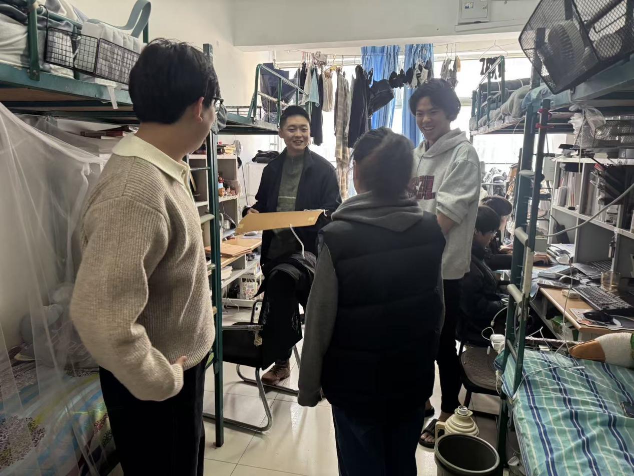 宿舍内暖意融融,师生间畅谈甚欢。针对大一新生在宿舍适应、专业学习方面的困惑,老师们结合学院专业特色与资源优势给出具体建议;针对大三、大四学生关注的考研、考公、实习就业等核心需求,老师们悉心解读最新政策导向、细致分享备考实用经验。同学们纷纷表示,此次走访不仅让大家感受到了学院的关怀与温暖,更对“一站式”社区的育人功能有了更深刻的认识,未来将主动营造优良宿舍氛围、深耕专业知识学习,以更饱满的热情投入到成长成才之路中。